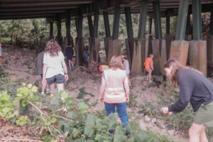 UGA College of Environment + Design students participating in the Rickles – Biodiversity Action Plan (BAP) Airport Project (F24-06) study the stream corridor beneath a bridge during a field visit.