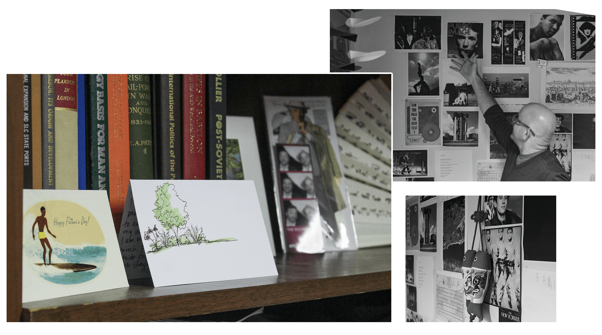 A glimpse into Stephen Ramos’ creative workspace, showing his bookshelf and inspiration wall filled with maps, images, and design references.